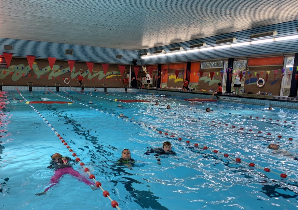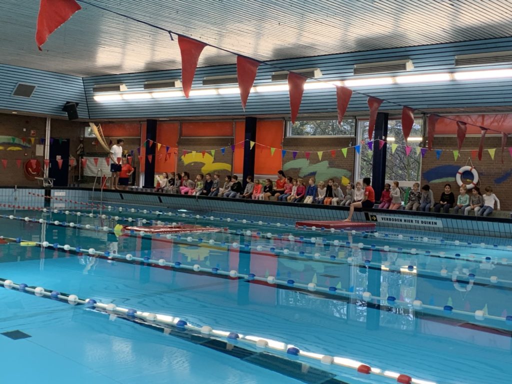 De gezellige tribune in het Vijf Meibad zat drie uren vol met toeschouwers die met grote belangstelling de verrichtingen van hun (klein)kinderen volgden. Alle kinderen hebben met goed gevolg aan de zwemdiploma vereisten voldaan. Iedereen geslaagd. Dat betekende 102 blije kinderen, honderden trotse ouders en familieleden en een groot compliment voor het vrijwilligersteam die de zwem ABC lessen verzorgen in het Vijf Meibad.
