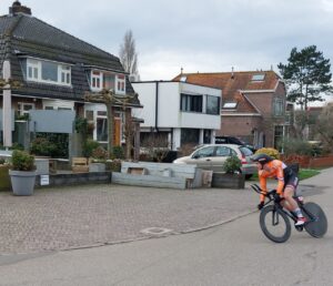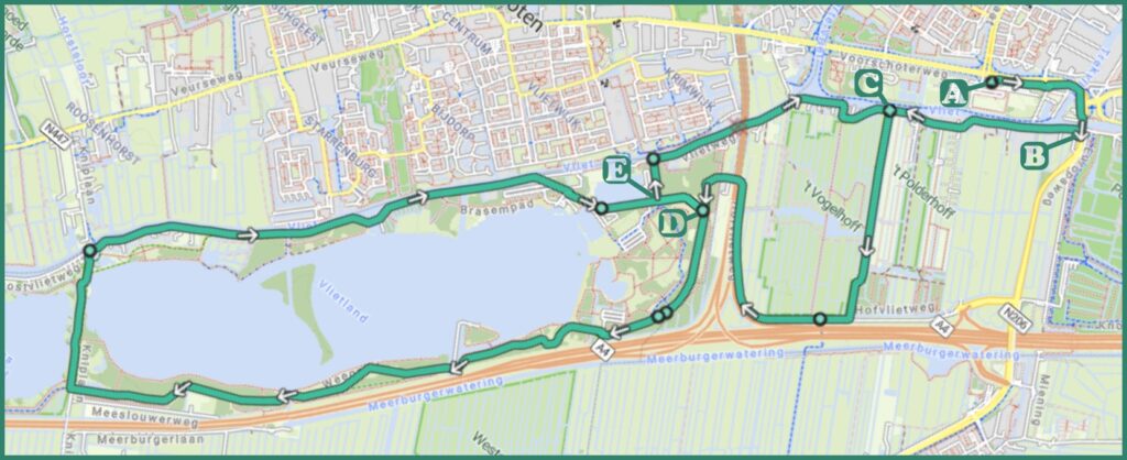 Na het looponderdeel pak je de fiets in de wisselzone (A). Je loopt met de fiets aan de hand tot voorbij de opstapstreep, en dan kan het fietsen beginnen. Via een verbindingspad kom je op het fietspad van de Voorschoterweg. Dit volg je over twee bruggen. Dan volgen bij B twee scherpe bochten en vervolgt de route langs de Vliet. Bij C sla je linksaf het natuurgebied in. Bij D sla je linksaf en volg je de autoweg die later overgaat in fietspad. Na twee keer rechtsaf gaat de route weer langs de Vliet tot aan E. Voor een volgende ronde rijd je bij E rechtdoor richting D. Heb je er 2 of 5 rondes op zitten, sla dan linksaf. Via C en B rijd je dan weer terug naar de wisselzone.
